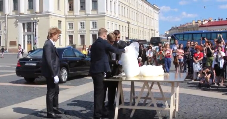 For the public program of Manifesta 10, which took place in St. Petersburg in 2014, Pavel Brăila realized a performance on the square in front of the Hermitage. 'The Golden Snow of Sochi' was also presented in a small refrigerator at Documenta 14 in Athens in 2017.